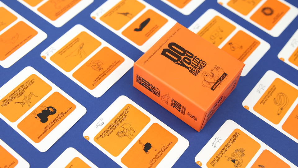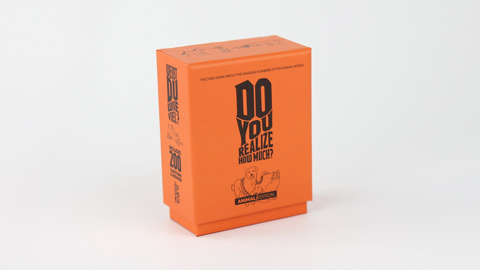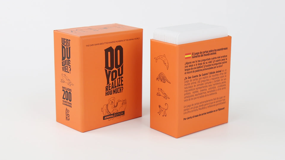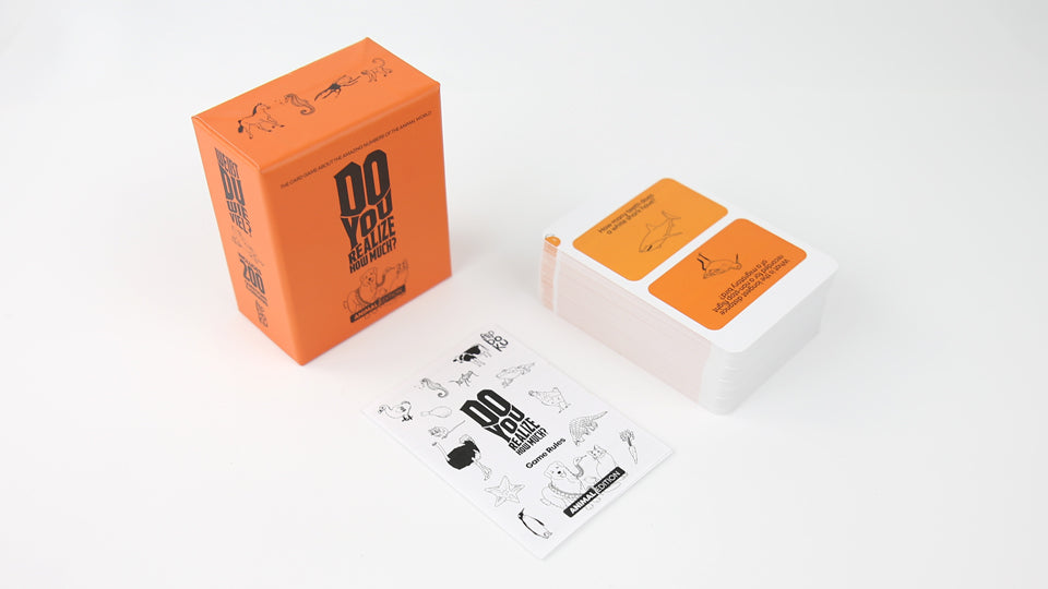 ¿Te Das Cuenta De Cuánto? Edición Animal, es un juego de cartas que explora las inauditas cifras del mundo animal. 200 preguntas y respuestas sobre la naturaleza de animales comunes y también de sus más exóticos representantes. Aves, mamíferos, peces, anfibios, reptiles, insectos, arácnidos, crustáceos, cefalópodos, equinodermos, nematodos y otros seres vivos de los que no sabías de su existencia.