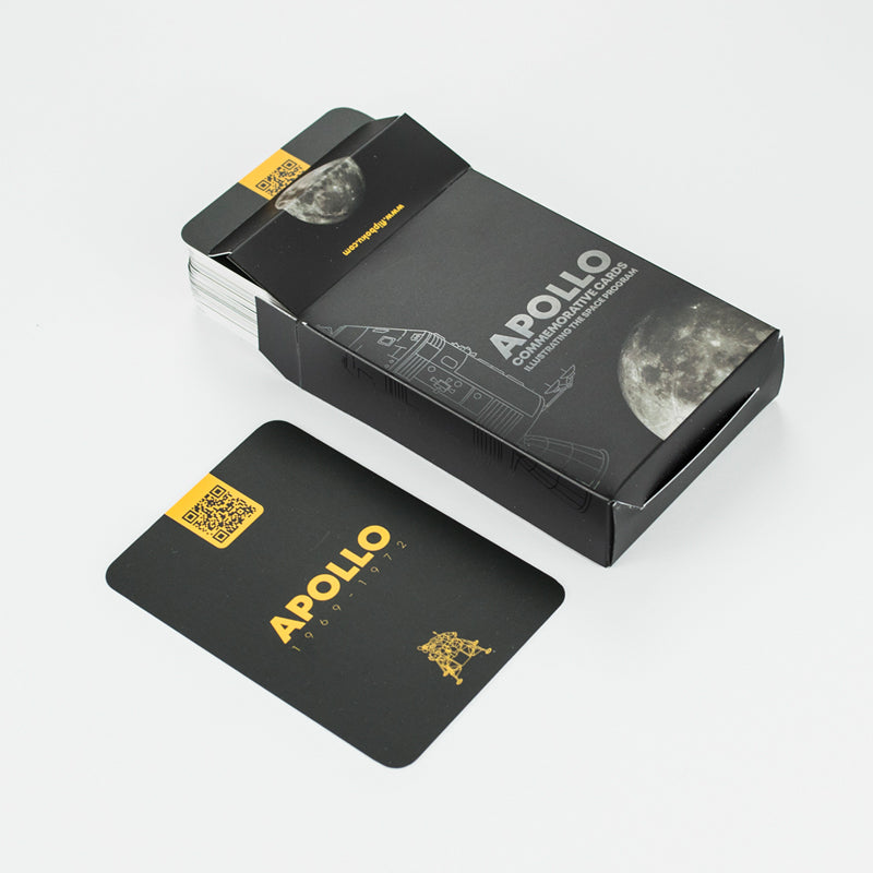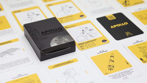 Incluye 70 cartas cuidadosamente diseñadas, que representan tres categorías diferentes: 32 astronautas de todas las misiones Apolo, 18 de los experimentos científicos llevados a cabo por los astronautas y 20 cartas que muestran los vehículos y el hardware que los llevaron hasta allí... y de vuelta a la Tierra.