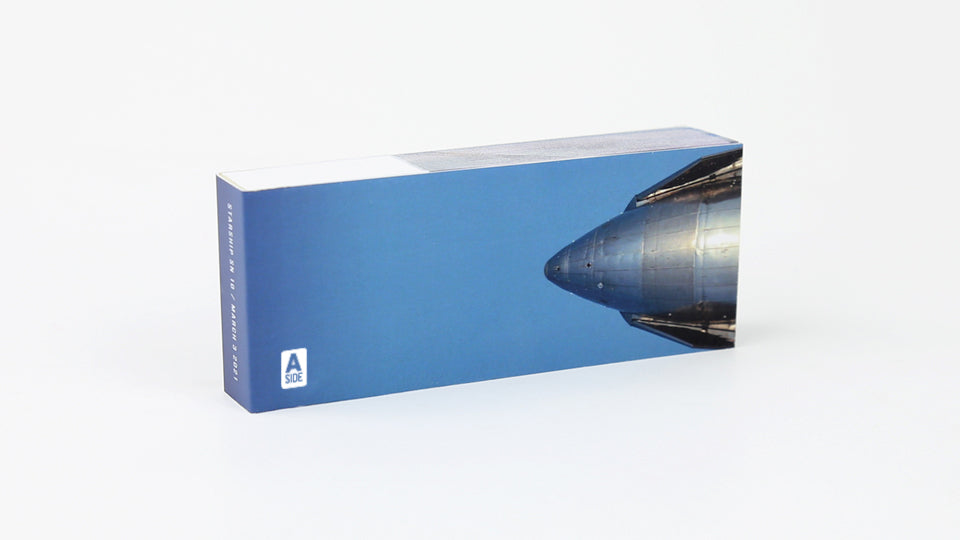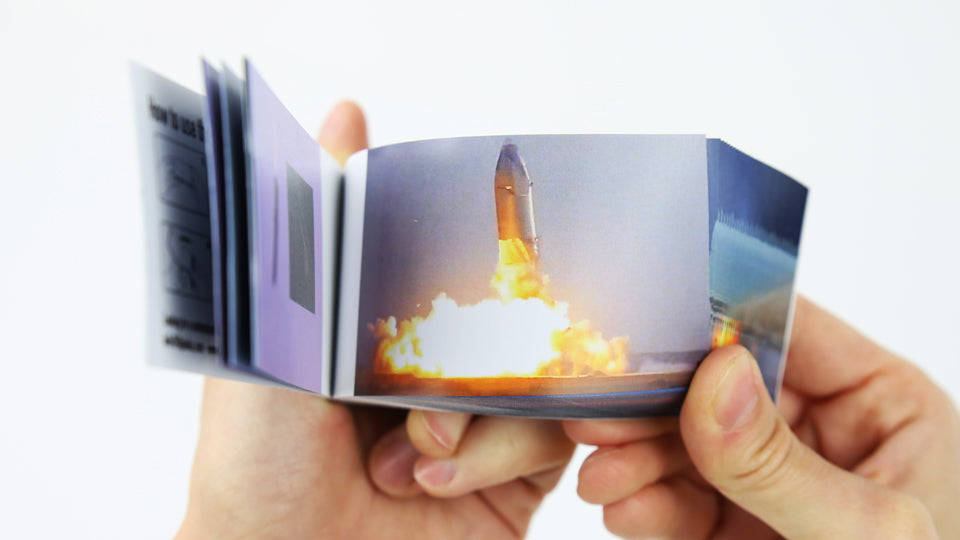 En este flipbook 6x1 podrás recrear una y otra vez los momentos más memorables del lanzamiento del Starship SN10, desde su despegue hasta su aterrizaje (incluido el final explosivo). Además, el flip book incluye Realidad Aumentada, permitiendo ver la secuencia completa del lanzamiento en video y en la palma de tu mano.