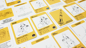 Incluye 70 cartas cuidadosamente diseñadas, que representan tres categorías diferentes: 32 astronautas de todas las misiones Apolo, 18 de los experimentos científicos llevados a cabo por los astronautas y 20 que muestran los vehículos y el hardware que los llevaron hasta allí... y de vuelta a la Tierra.